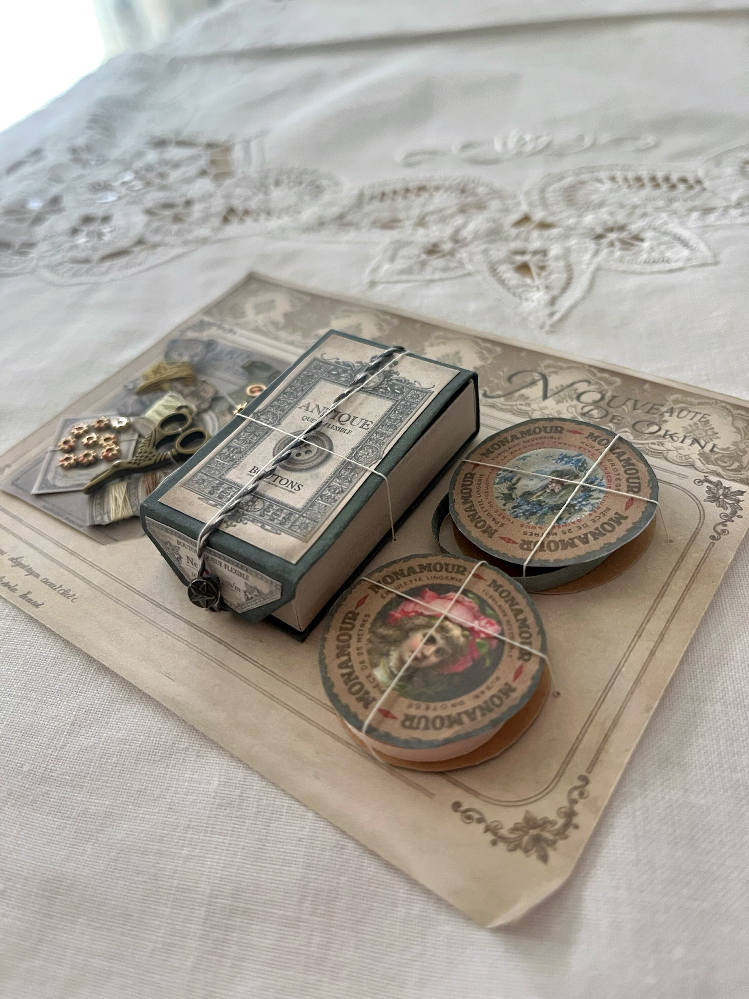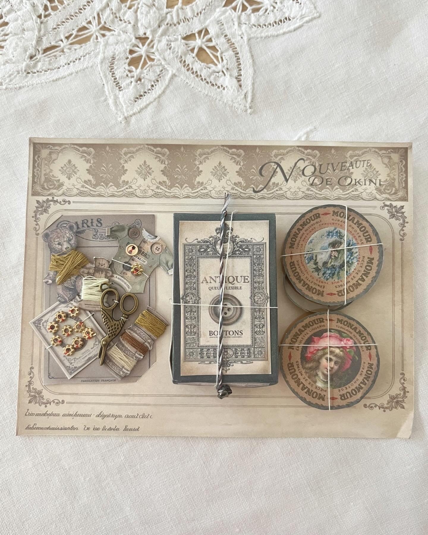 ボタンBOX、リボン巻き、コレクションシートのセットです。